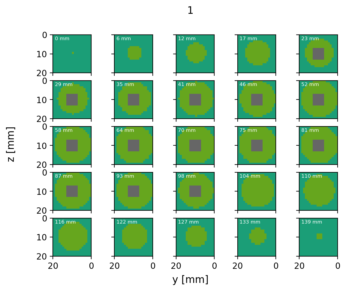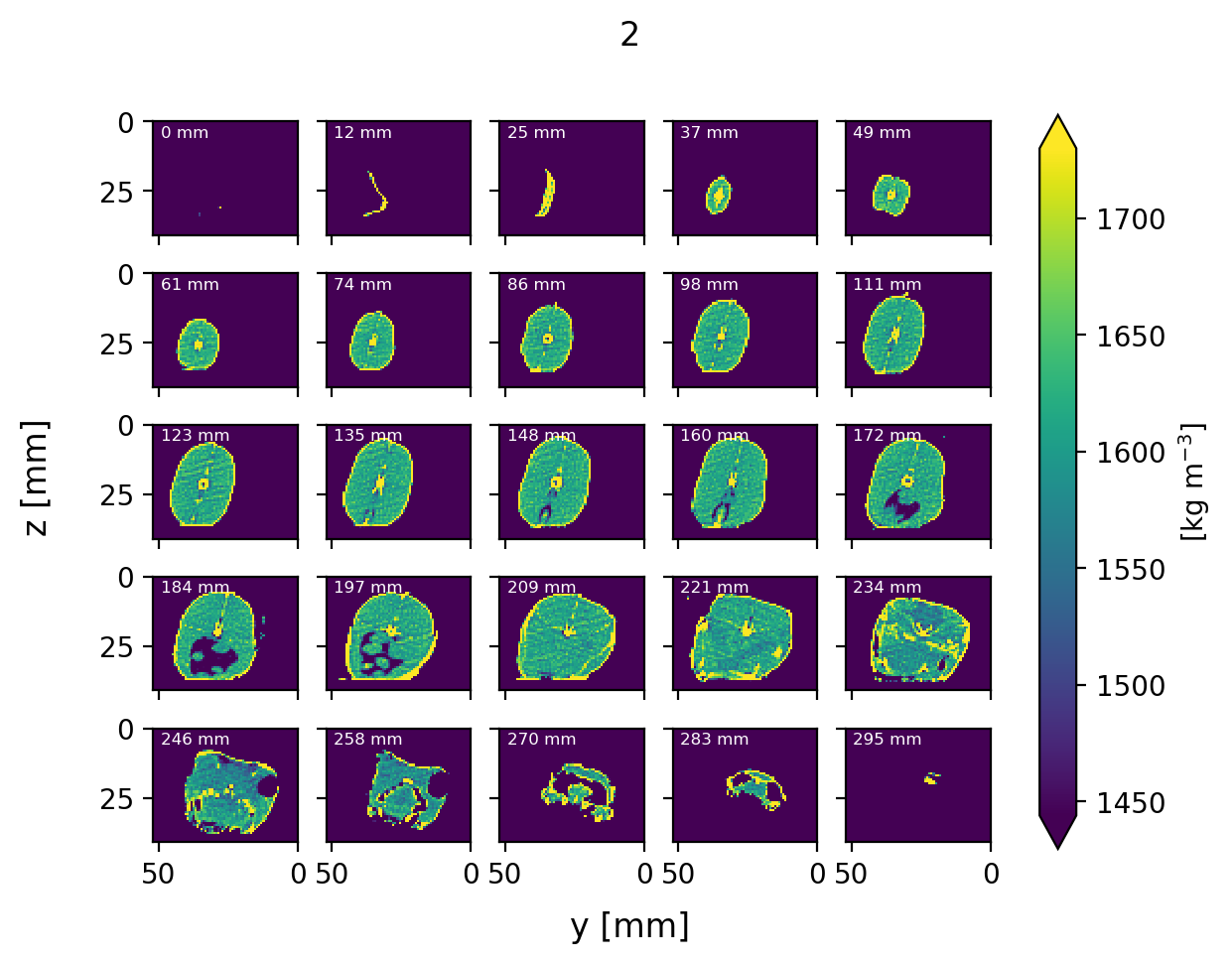 The categorised voxels format uses a single 3D matrix of material property categories (named categories in the schema) - for echoSMs these categories must be integers starting at 0. The categories define regions of homogenous material properties in the specimen. The category value is used as a zero-based index into associated mass_density and sounds_speed_compressional vectors. Hence, the length of the density and sound speed arrays must be at least one more than the highest category number in categories. The category matrix is structured the same way as for the voxels format (see above).